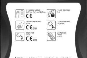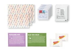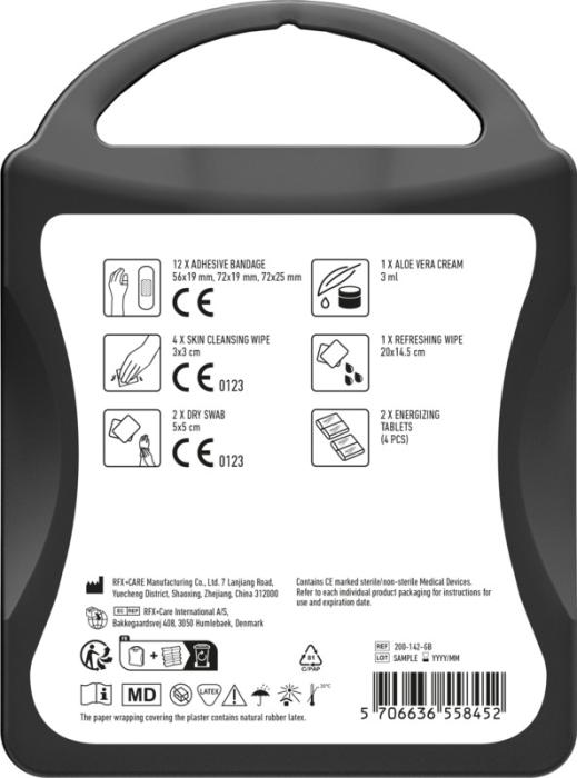 Indhold: 12 vandfaste plastre, 2 energigivende tabletpakker (4 stk), 1 forfriskende serviet, 1 aloe vera-creme, 4 hudrensende servietter, 2 tørre servietter.