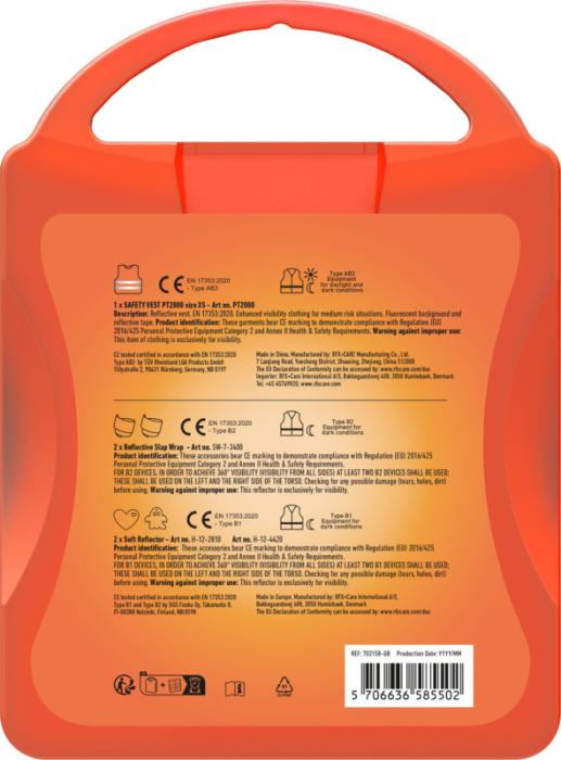Indhold: 1 sikkerhedsvest, 2 slap wraps og 2 hængereflekser.