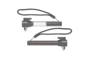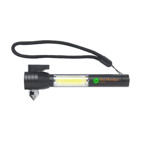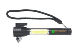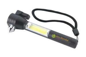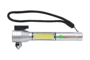 4-i-1 aluminium bilværktøj med: sikkerhedshammer, seleskærer, magnet og lommelygte med COB-lys.